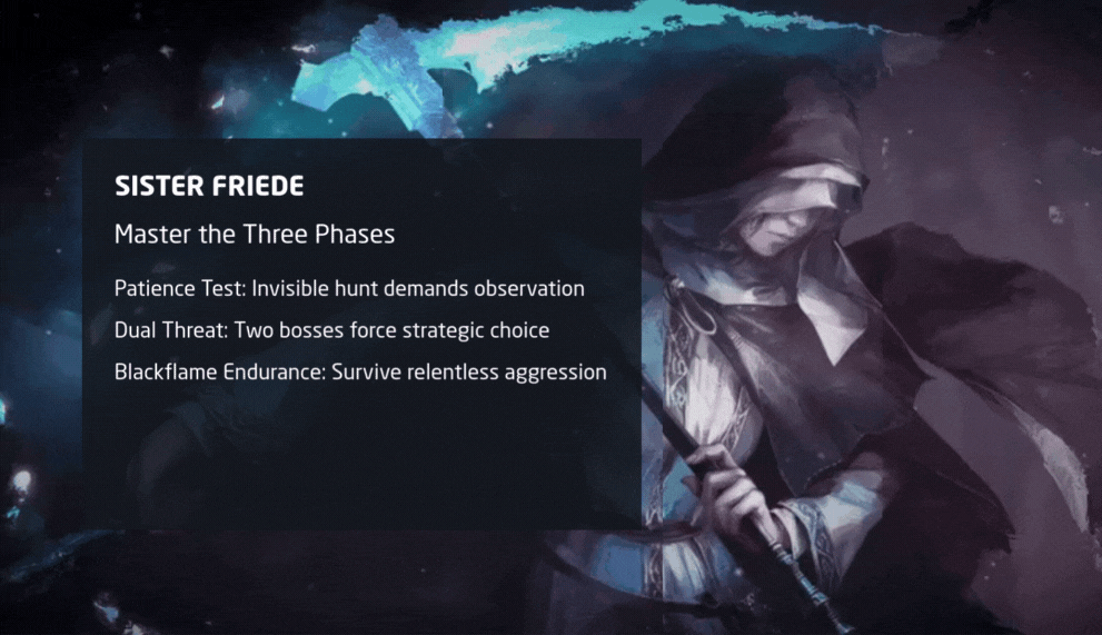 Friede's journey is one of inverted purpose. Once a guardian of the Painted World, she sought to extinguish its flame, believing mercy meant oblivion. Her three phases mirror a psychological collapse: calculated control (invisibility), desperate alliance (calling Ariandel), and self-annihilating rage (blackflame). The fight tests not just skill, but your empathy for a broken character who chose destruction as salvation.